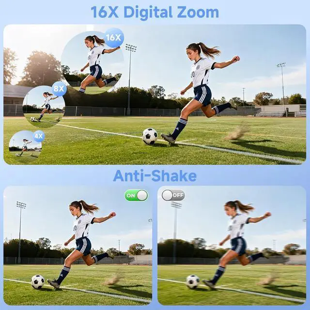 16X Digital Zoom & Anti-Shake: With the easy-to-use W/T button, you can smoothly zoom in or out to capture concerts, music festivals, distant landscapes, wildlife, skiing action, sunsets, and so much more. This small digital camera makes it simple to get close to the moment, and its built-in anti-shake technology helps keep your photos steady, sharp, and beautifully cleareven when youre on the move.