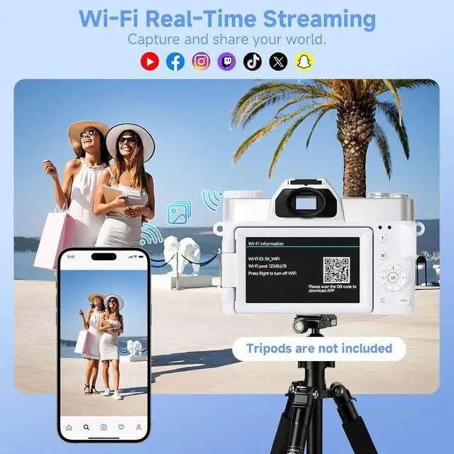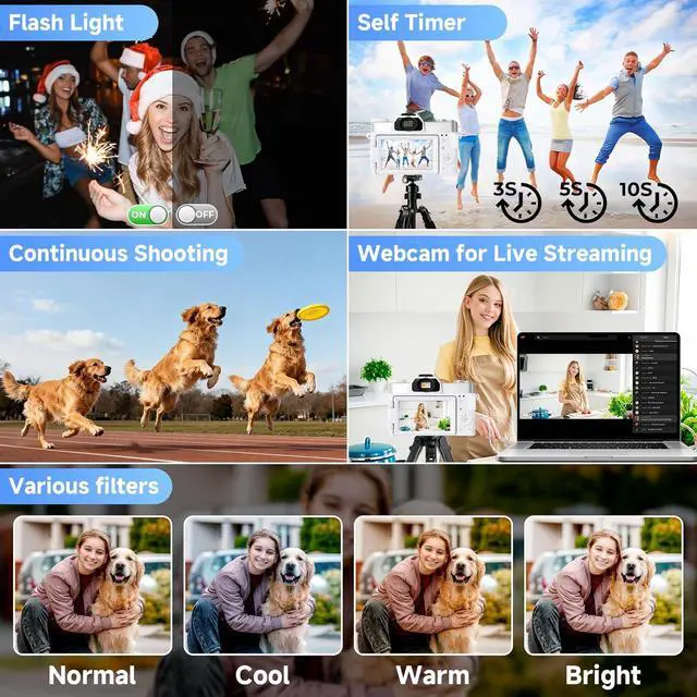 WiFi Transfer & Webcam: With built-in high-speed WiFi connectivity, this portable camera lets you instantly share adorable pet moments, unforgettable parties, exciting concerts, thrilling games, and scenic travel adventures anytime, anywhere. The compact digital camera also works as a versatile HD webcam, allowing you to livestream smoothly on TikTok, Facebook, YouTube, and other popular social media platforms with ease.