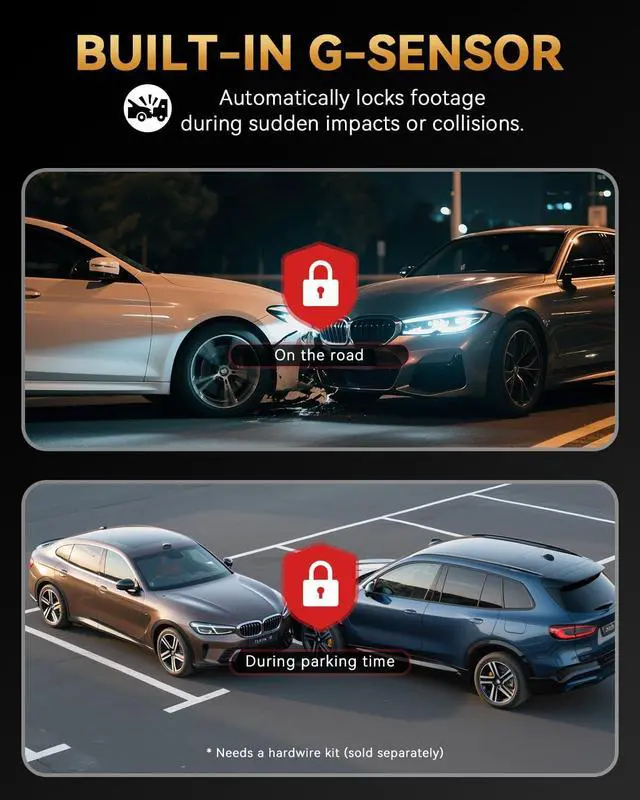 24-Hour Parking Monitoring: Protect your vehicle with time-lapse recording and G-sensor detection to monitor potential damage or theft. The car dash cam supports time-lapse video mode, recording continuously for 24 hours at a low frame rate and low power consumption, capturing one frame per second. When the vehicle is parked, any collision event will automatically trigger recording and lock the video. Please note: A separate hardwire kit is required for parking mode