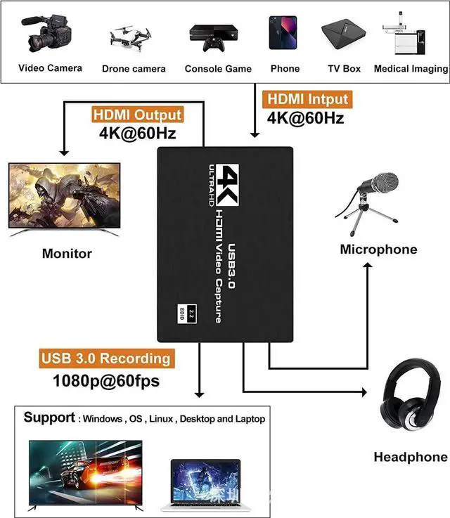 - Easy to carry and good compatibility: 4K@60Hz HDMI to USB3.0 video capture card, easy to carry, superior performance, good compatibility, simple installation, powerful features, etc., can collect 1 HDMI input signal