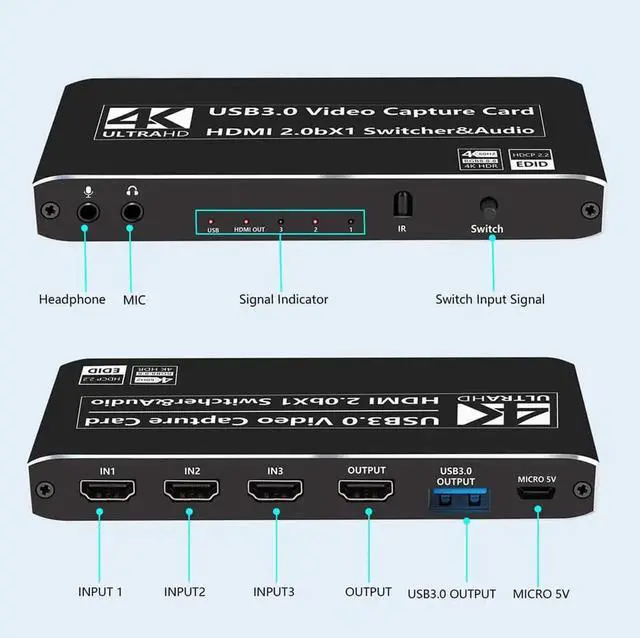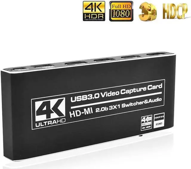 4K@60Hz 3x1 HDMI Switch USB 3.0 HDMI video capture card ,4k HDMI Game Capture Card 1080P USB 3.0 With HDMI Loop-out With Microphone Input and Audio output 1080P HDMI Pass-through Display with IR remote control