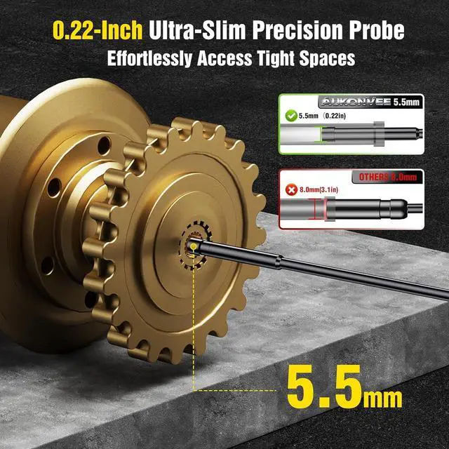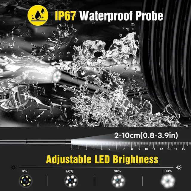 0.21 -inch Ultra Thin Probe & IP67 WaterproofThis endoscope camera with light has an IP67 waterproof rating, which can maximize dust and water resistance, and the 0.21 -inch Ultra Thin lens inspection camera probe allows it to slip into tight spaces effortlessly. 4 adjustable LED lights + 0.79 " - 3.93 " focus ensure crystal-clear inspections in dark/dusty environments.