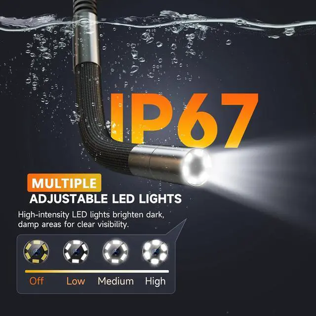 [HD Camera + 6 Adjustable LEDs: Clear View in Any Lighting] Capture sharp visuals in full HDeven in complete darknesswith six brightness-adjustable LEDs and an IP67 waterproof lens. Perfect for engines, plumbing, or HVAC inspections.