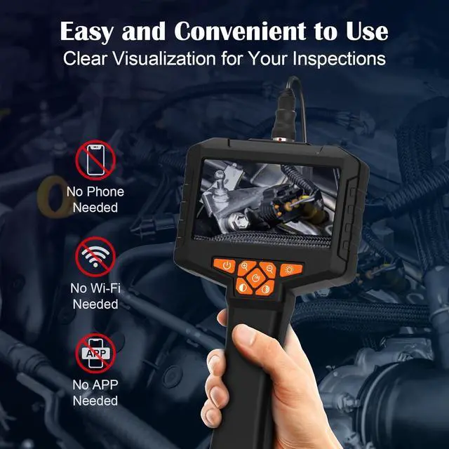 IPS SCREEN: Endoscope camera with light featuring a 4.3 inch HD IPS screen with a 170 degree viewing angle and 8 adjustable LED, it delivers vivid 1920x1080P high-definition images instantly on startup; Say goodbye to smartphone apps and driver downloads simply power on and inspect with ease; Inspection Camera ideal for mechanics and pros needing precise inspections