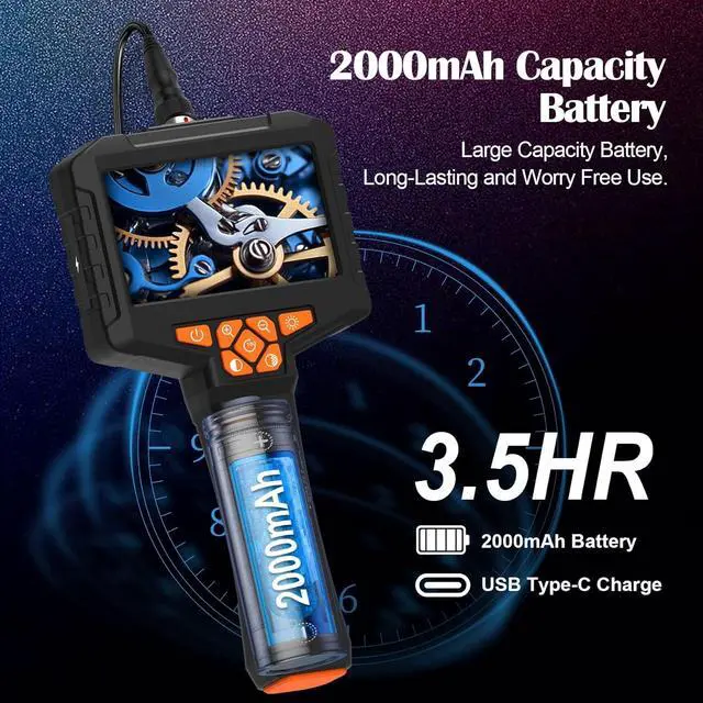 HANDHELD ENDOSCOPE: Handheld endoscope camera designed for effortless inspections; Its ergonomic grip ensures stability and comfort during operation with one hand; The non-slip matte body makes the endoscope camera with light comfortable to hold, light and convenient and more convenient to use; Built-in 2000mAh rechargeable battery for up to 3.5 hours of use