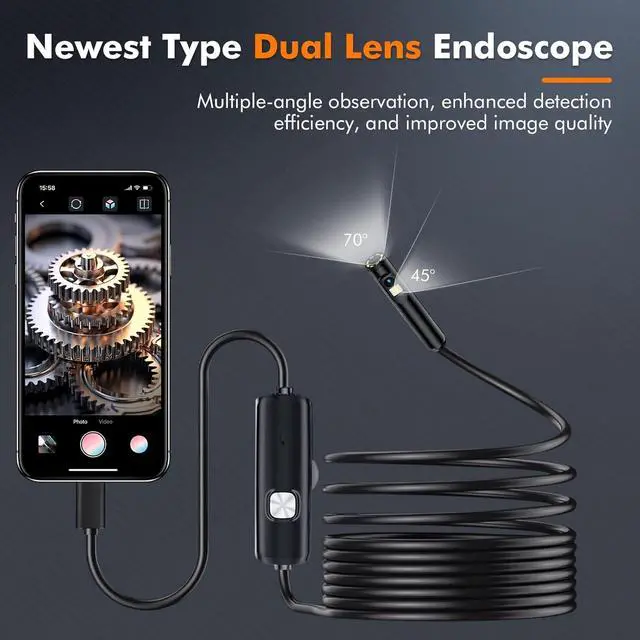 Dual Lens Inspection CameraThis endoscope camera with light offers a unique perspective with two lenses, providing a versatile and comprehensive view for your inspection needs. The dual lenses borescope allow for detailed and clear imaging in various scenarios. 0.7 -4in best field of view to see clearer. (Note: The dual lenses are not used simultaneously, long press to switch the Side lens)