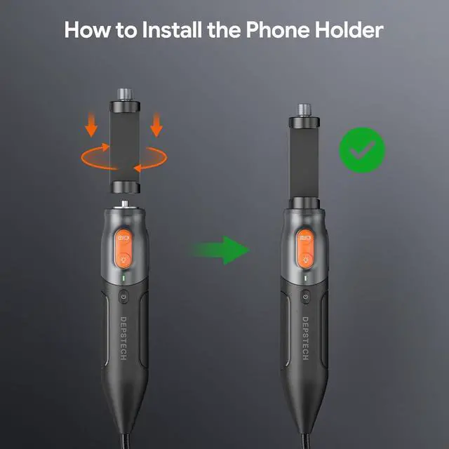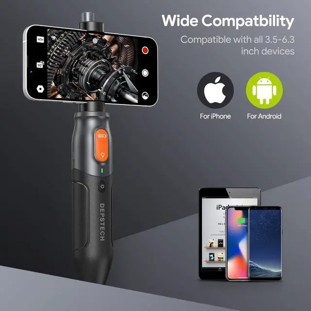 Unique Handheld DesignErgonomic Handle plus compact buttons design, all the operations can be performed with one hand. Adjustable phone holder fits for all 3.5 - 6.3 inches devices. The rechargeable battery supports up to 3 hours working time. The lightweight carrying case provides extra protection for the bore scope, keeps all accessories organized as well, easy to carry for outdoor use.