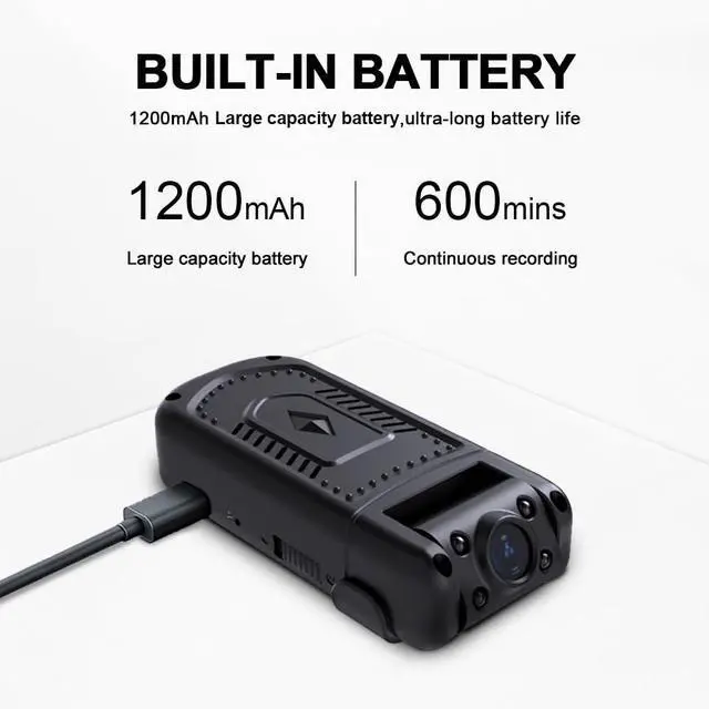 This body camera has built-in a 1200 mAh large capacity battery. When it’s fully charged, you can record 5-7 hours of video in Video Mode Even if you are traveling for a long time, you don't need to worry about lack of battery capacity. Reduce the trouble of constant charging for small camera in daily life,also save money,right?