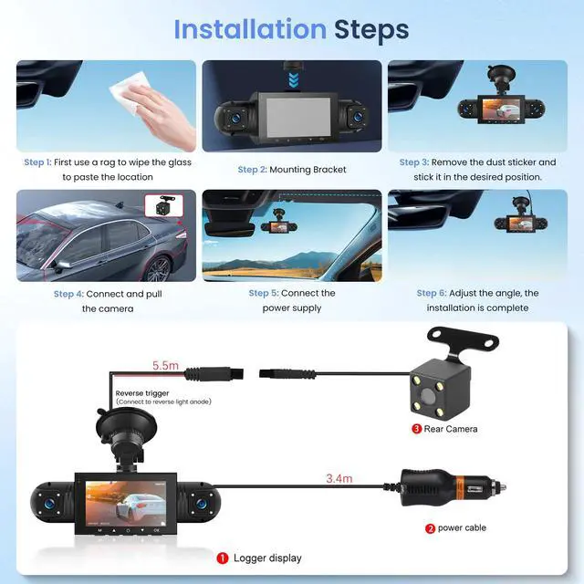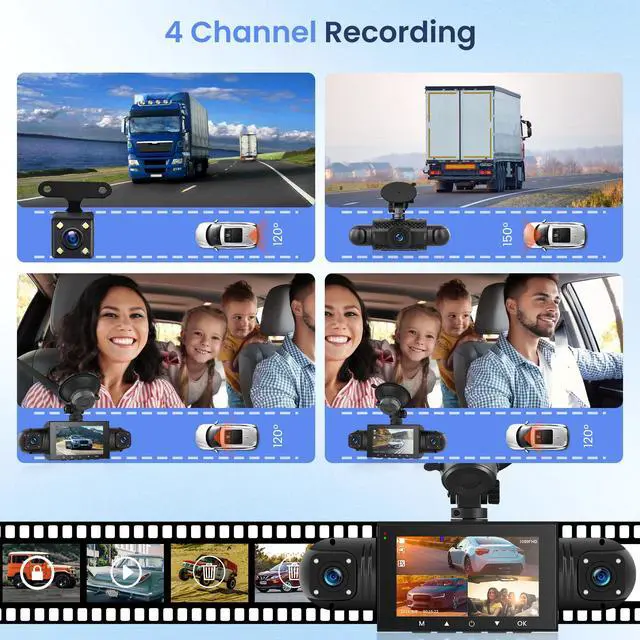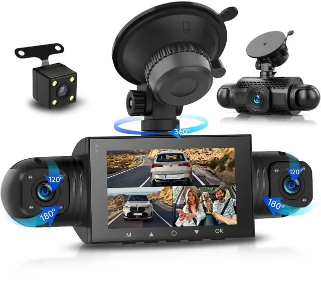 360° All Sides Dash Cam 4 ChannelThe Rimoody 4 Channel Dash Cam offers 360° all-around coverage with its four lenses(3 Front 480P + 1 Interior 1080P). This allows for the simultaneous capture of the front, rear, left, and right sides of the vehicle. The front three lenses are adjustable, enabling you to capture more details as desired. With this feature, the dash cam easily covers 360 degrees, ensuring there are no blind spots around the car.