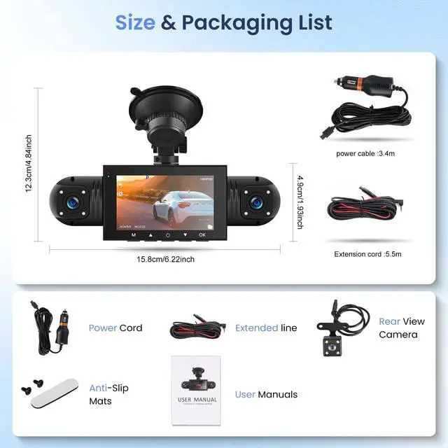 8 IR lights Night VisionThe dashcam features 8 LED infrared lights and wide dynamic range technology to prevent overexposure from headlights and auto-adjust the balance in low-light conditions. It detects sudden changes in brightness and automatically adjusts for clear recording. The front and rear interior cameras with infrared lights capture crisp cabin images even in unlit environments, significantly enhancing nighttime driving safety.