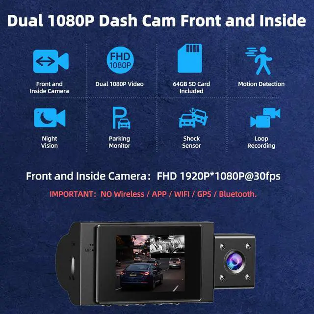 Dual 1080P Dash CamIMPORTANT!!! NO Wireless,NO APP,NO WIFI,NO GPS,NO Bluetooth. This dash cam front and inside features both a front camera and an inside camera, both supporting 1920×1080P resolution and 30 frames per second video output, providing clear coverage of six lanes ahead and the entire interior of the vehicle. The dual lenses offer ultra-wide 170° and 140° viewing angles, ensuring panoramic recording without blind spots.