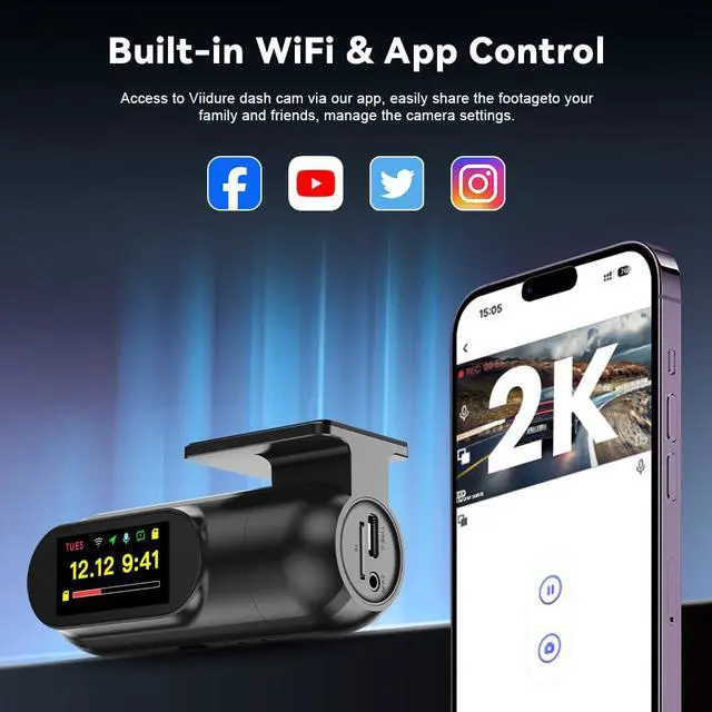 The built-in WiFi (9-16ft range) allows seamless connection to free apps (Viidure/RoadCam) for instant viewing, downloading and sharing footage.