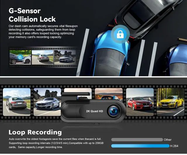 2K Dashcam with Loop Recording& Accident Lock Loop recording can keep car dashcam camera auto overwrites the oldest file when the memory card is full. The dash camera front and back is built in G-sensor, which can save video evidence of collisions when car was hit, that video will be automatically locked and retained without being overwritten to ensure this security camera for cars will save your important footage
