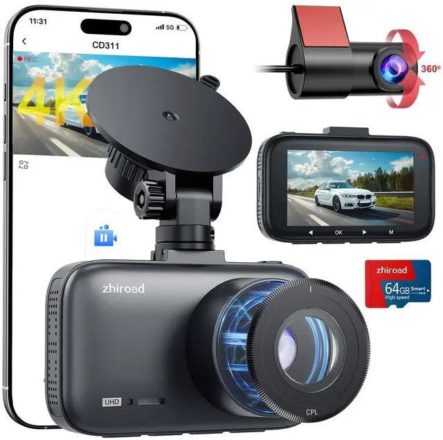 Real 4K+Upgraded 360° Rotatable 1080P Dual Dash Cam Zhiroad front and rear dash cam is equipped with 4K (3840*2160P) Ultra HD front camera and 1080P rear camera, delivering crystal-clear video quality for both front and rear views. The upgraded Rear Camera is 360° Rotatable.170°wide-angle front camera +140°rear camera, offering comprehensive coverage of the road ensuring that every critical detail, from vehicle license plates to road signs, is captured with stunning clarity.