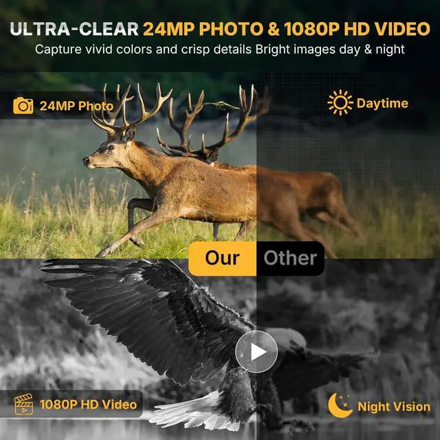 Ultra-clear photos and videos: This trail camera features a high resolution of 24MP and 1080P, ensuring vibrant images and clear videos, even in low-light conditions.