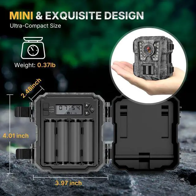 Low power consumption: This mini trail camera requires only 4 AA batteries, reducing both its size and weight. Its extremely low power consumption in standby mode means you can leave it in the field longer without needing to change batteries frequently.