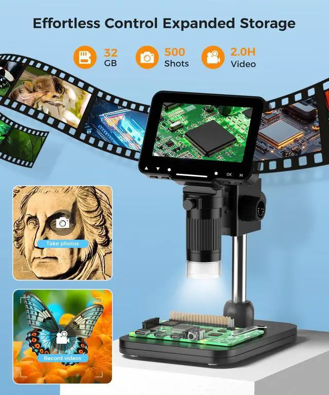 4.3-Inch High-Definition LCD Screen and 32GB Card4.3-inch screen microscope can capture a clear detailed view of the object in a certain area of the picture and record video, and record a clear micro-world experience, The images and videos obtained during the observation process are saved in a 32GB SD micro card (Included 32microSD card).