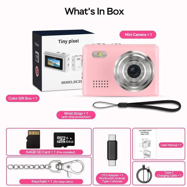 Packaging includes|:1* small camera, 64GB card, keychain camera accessories, wrist strap, Type-C cable & manual.