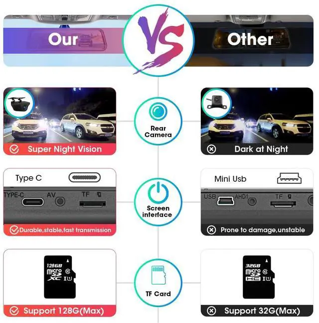 - Loop Recording G-Sensor & Supports 128G SD Card Max: When the SD card is full, it will cover the previous video file to continue the recording.This device has built in G-Sensor, if collision occurred to the car,the backup cam mirror will automatically locked the special video file, which will not be covered by the loop recording and stored to ensure that the most important videos are not lost. In addition, the dash cam supports 128G SD card max (not included),can record more important moments.