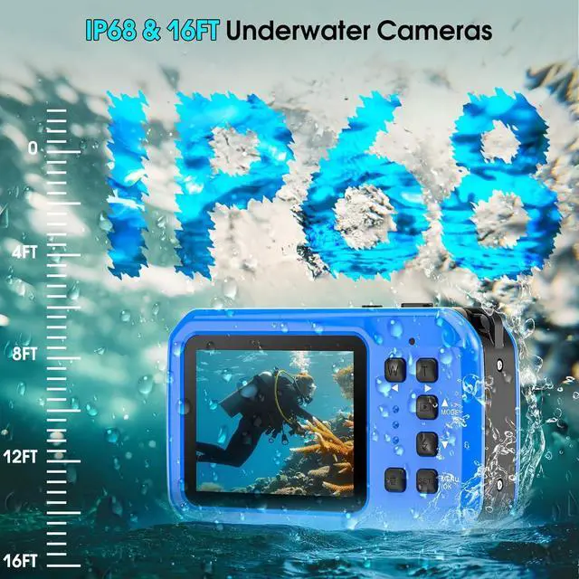 IP68 & 16FT Floatable CamerasThis underwater camera is maximum waterproof up to 16 feet. Unlike ordinary digital cameras, this underwater camera is built to withstand shocks, drops, and bumps due to its robust construction. Whether you're a long-distance swimmer or looking to capture some memories on the lake, this camera offers some of the best underwater videos. For a little extra protection, if your snorkeling camera slips from your grip, it'll float to the surface and be easy to spot.