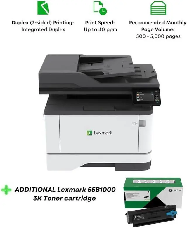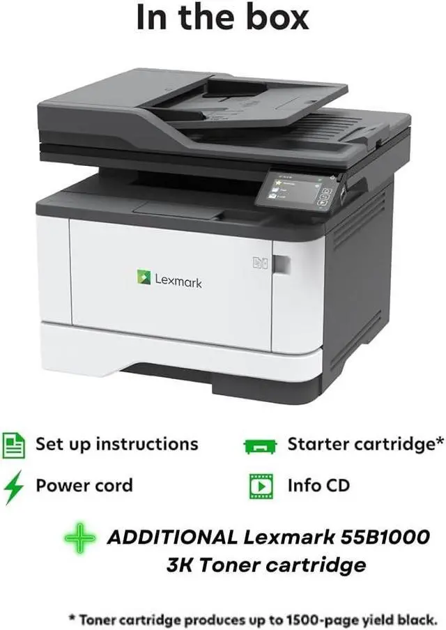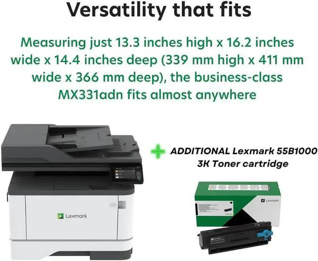 Includes MX331adn Laser All-in-One Printer and (1) starter toner cartridge (produces up to 1,500-page yield black)