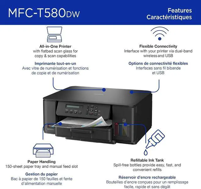 INNOVATIVE REFILLABLE INK TANK TECHNOLOGY: Brother Genuine no-spill bottles quickly refill the tank in 30 seconds for color, 65 seconds for black. The design prevents inserting the incorrect bottles for each color. Includes up to 3 years of ink in-box(1).
