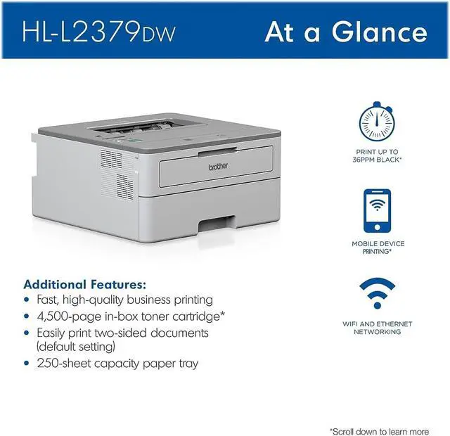 Designed for how work now works, this compact printer is perfect for today's corporate home offices and small offices. Dimensions: 7.2"H x 14"W x 14.2"D. LCD display enables easy setup and navigation. Manual feed slot offers flexibility for printing a variety of media and sizes, such as cardstock and envelopes. Package includes: Brother HL-L2379DW, super high-yield toner cartridge (4500 pages), DR730 drum (12000 pages), quick setup guide, installation CD-ROM (macOS available via download).
