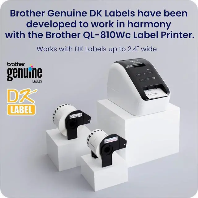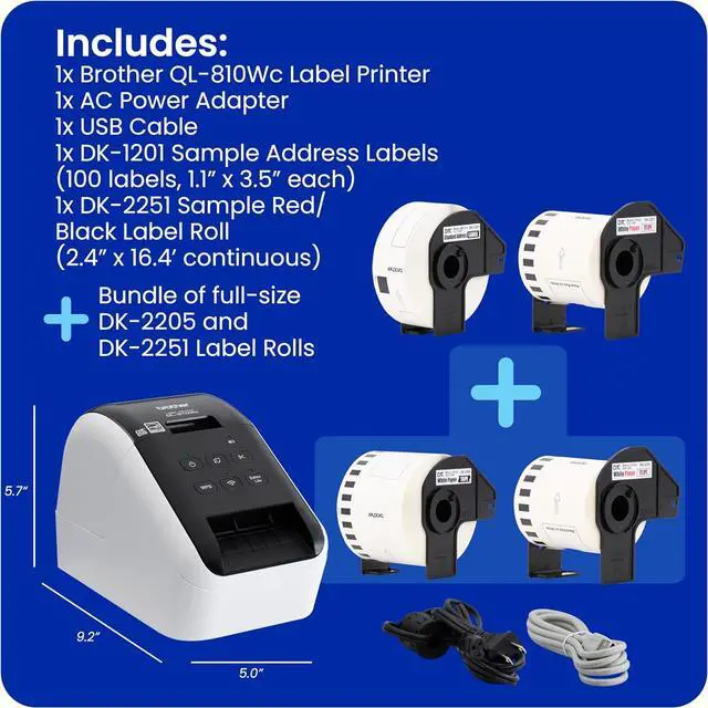 Complete Labeling Solution; This Brother QL Printer bundle includes the QL-810Wc Ultra-Fast Label Printer, USB cable, AC power adapter, starter label rolls DK-1201 and DK-2251, PLUS full-size rolls of DK-2205 and DK-2251, in one convenient bundle