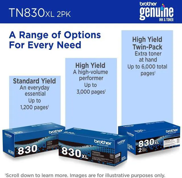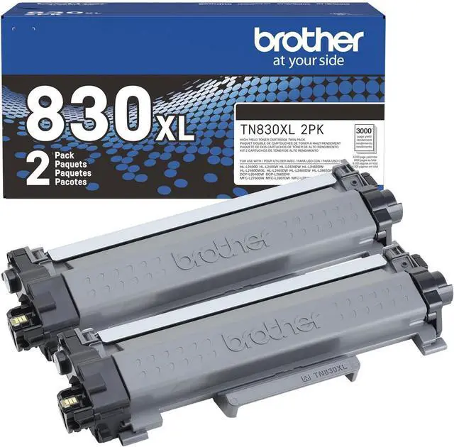 Print confidently and print more with Brother Genuine TN830XL 2PK High Yield Black Toner Cartridges. A sensible and convenient choice, this twin-pack contains two TN830XL black toner cartridges perfect for stocking up for uninterrupted printing. Expertly engineered, Brother Genuine Toner is the only toner brand recommended for Brother Monochrome (Black & White) Laser Printers. Providing an impressive combination of lower print costs per page and the convenience of fewer cartridge changes compared to our Standard Yield TN830 cartridges, its an excellent choice for efficient, high-quality laser printing. With the reassurance of dependable compatibility, this cartridge produces crisp, precise results and delivers page yields up to 3,000 pages per cartridge, for a total of up to 6,000 pages.(1) A must-have for consistently impressive quality, Brother Genuine Toner is the reliable choice for producing professional documents and personal paperwork with ease. When using a wireless printer, the Brother Mobile Connect app puts the power of printer and supply management in your hands, enabling you to monitor toner levels from the convenience of your mobile device.(3) When its time to replace your printers toner cartridge, the Brother Genuine brand provides seamless toner refills. Or try the worry-free ease and flexibility of a Brother Refresh EZ Print Subscription smart ink & toner service to never worry about running out of toner again.(3) For best results, use with Brother multi-function and all-in-one monochrome laser printers: HL-L2400D, HL-L2405W, HL-L2420DW, HL-L2460DW, HL-L2460DWXL, HL-L2465DW, HL-L2467DW, HL-L2480DW, HL-L2865DW, DCP-L2640DW, DCP-L2647DW, MFC-L2760DW, MFC-L2807DW, MFC-L2820DW, MFC-L2820DWXL, MFC-L2900DW, MFC-L2900DWXL, and MFC-L2980DW. 4. Disclaimers 1. Approx. toner cartridge yields in accordance with ISO/IEC 19752 (Letter/A4). 2. Visit manufacturers website for more information. 3. Free app download and wireless connection required. Compatibility may vary based on device and operating system. The following printer model is not compatible with Brother Mobile Connect app: HL-L2400D. Images are for illustrative purposes only. Specifications subject to change.