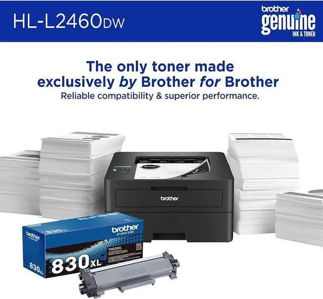 INCLUDED IN THE BOX: Brother HL-L2460DW Printer | Starter Black Toner Cartridge (Approx. 700-page yield) | DR-830 Drum Unit | AC Power Cord | Quick Setup Guide | Product Safety and Protyection Information