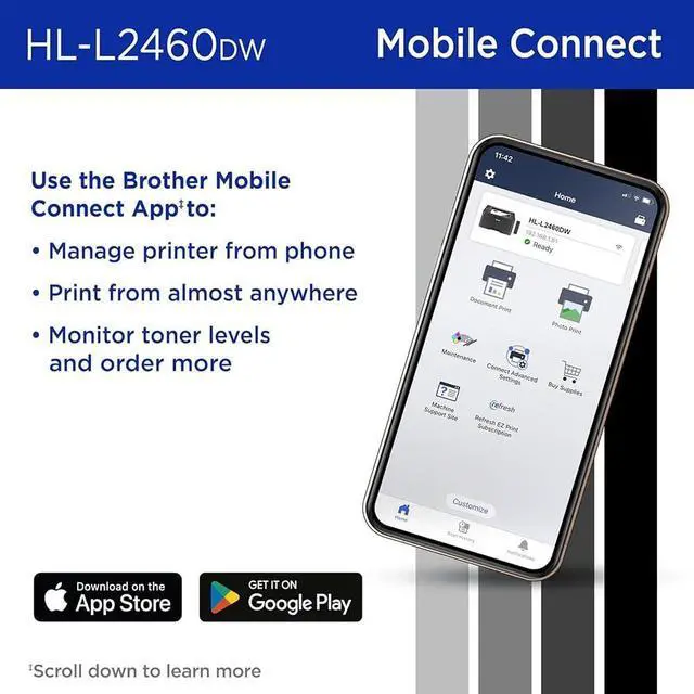 Reliable Toner Management: Eligible for Brothers Refresh EZ Print Subscription Service and includes advanced security features such as TLS/SSL, IP filtering, and 802.1x.