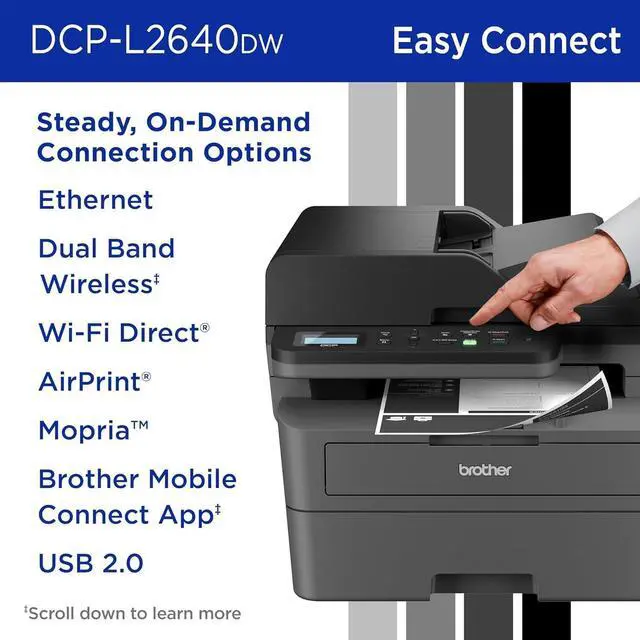 Flexible connection options: Easily navigate the changing demands of your business with built-in dual-band wireless (2.4GHz), Ethernet or connect locally to a single computer via the USB interface.