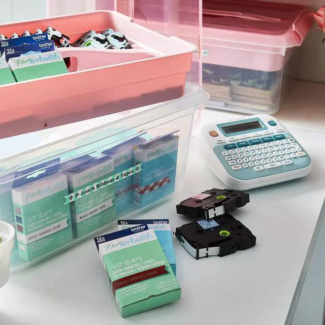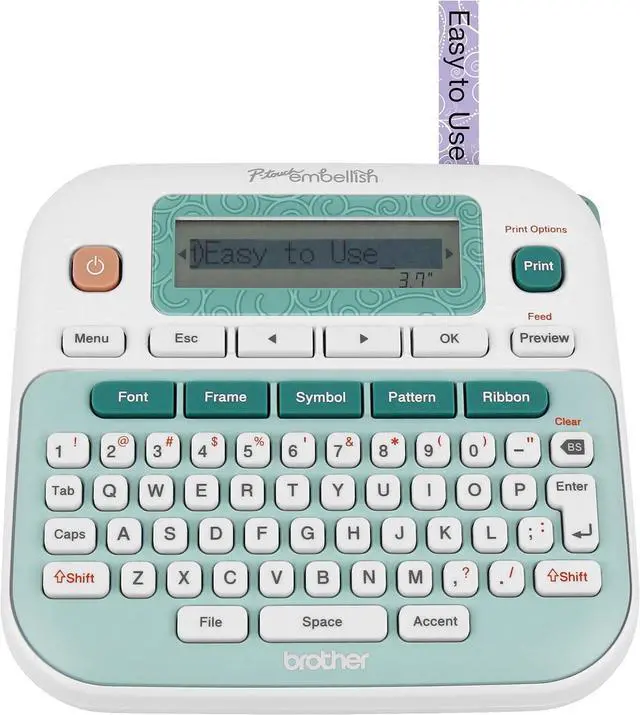 P-touch Embellish is the perfect creative companion for adding a personal touch to any event, celebration, occasion or holiday all year long. The P-touch Embellish Ribbon & Tape Printer PT-D215e from Brother helps you get creative and add your personal, decorative touch to satin ribbon, patterned, matte, solid color pastel and washi tape with a selection of 14 fonts, 400+ symbols and emojis, 90+ decorative frames, 20 continuous frames, 15 initial marks and, 25 patterns. Enjoy so many options with the built-in ribbon and label templates, print continuous patterns or repeating text. Its perfect for creating personalized ribbon and tape accents to add a decorative touch to gift-wrapping, party favors, scrapbooking, holiday celebrations, craft projects and so much more. The P-touch Embellish is fun and easy-to-use, featuring a QWERTY keyboard, 1-touch keys for easyformatting, built-in memory for up to 20 labels and print preview options so you can see what yourdesign will look like and helps cut down on wasted ribbon and tape. With P-touch Embellish you can alsoprint up to 9 of the same ribbon or tape at a time, perfect for party favors and projects. The P-touchEmbellish is lightweight and compact, making it easily portable so you can take it just about anywhere topersonalize, customize and organize on the go. Uses 6 AAA batteries or P-touch AC adapter (soldseparately). P-touch Embellish is also the perfect accessory to help you get organized; ideal for organizing your craftsupplies, household items, files and anything else that needs a decorative touch to make organizingmore fun. P-touch Embellish includes at your side support including a 1-year limited plusBrother free online, live chat or phone support for the life of the product.