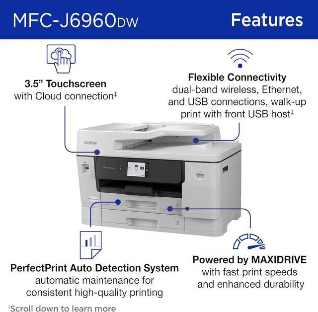BEST FOR SMALL BUSINESS: This multifunction printer makes it easy to print, copy, scan, and fax on up to 11x17 paper. Includes one 1,800-page yield black ink cartridge and one 750-page yield ink cartridge for each color in cyan, magenta, and yellow(2).