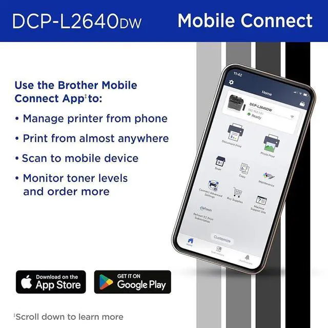 Flexible Connectivity Options: Dual-band Wi-Fi, Ethernet, USB, and mobile printing via Brother Mobile Connect, AirPrint, Mopria, and Wi-Fi Direct.
