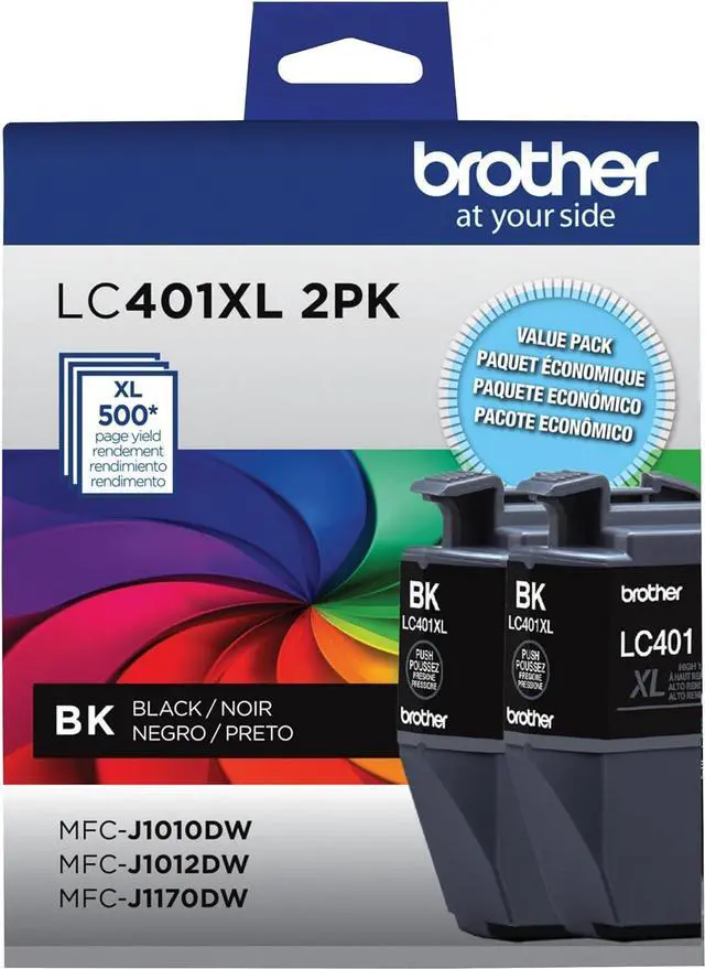 Trust Brother Genuine ink for superior inkjet print quality and performance you can consistently rely on. Brother Genuine LC401XL 2PK High Yield Black Ink Cartridges deliver consistent, professional print quality and ultra convenience you can count on for up to 500 pages per cartridge.(1) Brother Genuine ink is intelligently engineered to work seamlessly with your Brother inkjet printer to consistently produce sharp prints that withstand the test of time. Brother Genuine LC401XL 2PK provides the ultimate in convenience giving you 2 black ink cartridges in one package. A full range of single and multipack color and black ink cartridges is available that delivers high quality prints, reliable page yields and exceptional value. Brother Genuine LC401XL 2PK ink cartridges are for use with Brother affordable color inkjet all-in-one printers MFC-J1010DW, MFC-J1012DW and MFC-J1170DW. Brother offers an environmentally responsible way for customers to dispose of Brother Genuine cartridges at end of life. Visit manufacturers website for information. Disclaimer: (1) Approximate page yields in accordance with ISO/IEC 24711. For additional page yield info, see manufacturers website.