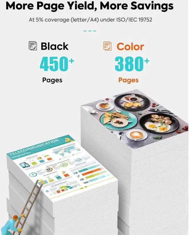 Extra-large Page Yield: 450 pages per black ink cartridge and 400 pages per tri-color ink cartridge based on 5% coverage (letter A4). Print more than your original one.
