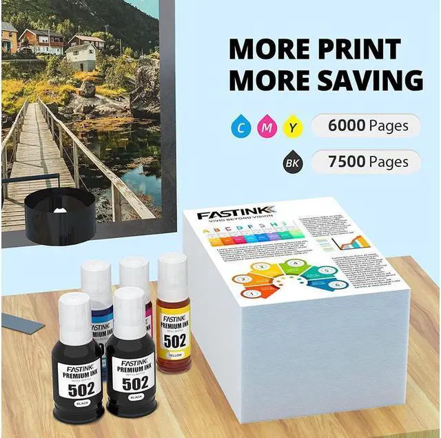 ?Get Sharp Text and Vivid Photos: 502 ink bottles ecotank contains high-quality dye ink with clear printing.Print clearly & smoothly, not clog the print heads,easy to refill (no need for syringes) ,environmentally friendly