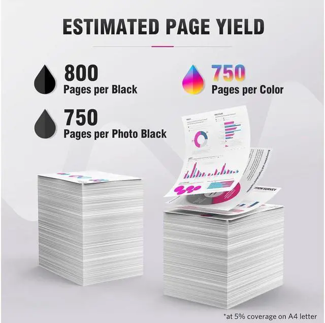 High yield: 800 pages per Black ink cartrige, 290 pages per Photo Black ink cartrige, 750 pages per Color ink cartridge on 5% coverage (letter/A4).