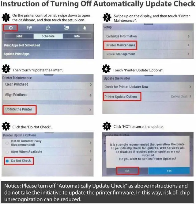 Note:This 902XL compatible ink cartridge is our new product launched in June 2020. In order to improve the related printer function, HP printers will upgrade the firmware of their printers frequently which will cause some chip recognition failure. Here we suggest you turn off the auto-update check function of your printer.