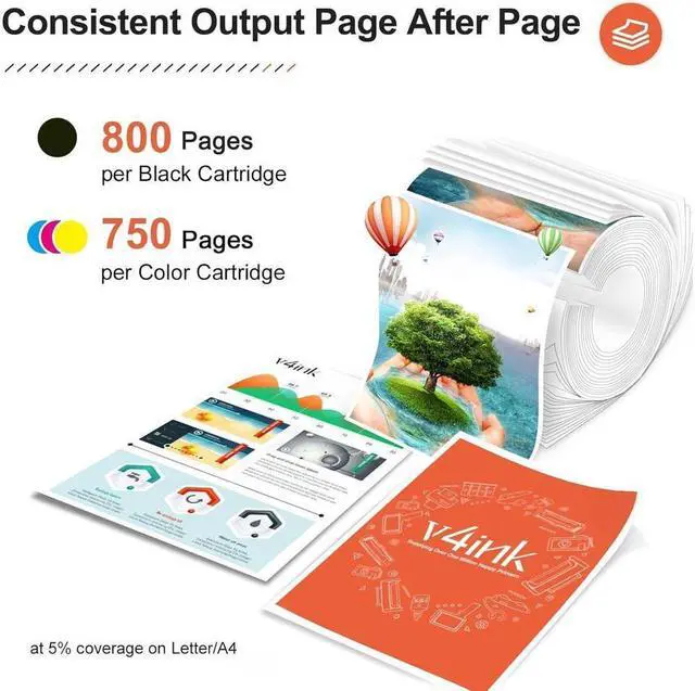 Print more and cost less: 800 pages per black ink cartrige, 750 pages per color ink cartridge on 5% coverage (letter/A4).