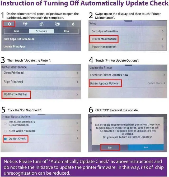 2020. In order to improve the related printer function, HP printers will upgrade the firmware of their printers frequently which will cause some chip recognition failure. Here we suggest you turn off the auto-update check function of your printer.
