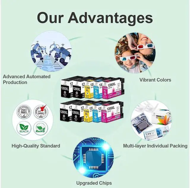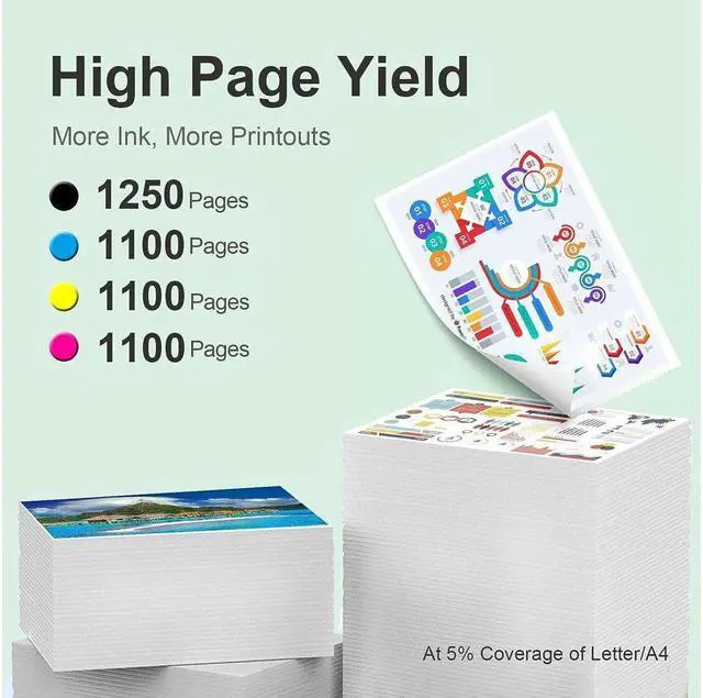 with Latest Chip Ink Type BK:Pigment Ink, C/M/Y: Dye InkBK:Pigment InkBK:Pigment Ink, C/M/Y: Dye InkBK:Pigment Ink, C/M/Y: Dye InkBK:Pigment Ink, C/M/Y: Dye InkBK:Pigment, Tri-color: Dye InkBK:Pigment Ink, C/M/Y: Dye Ink Package Combo 1200XL 10PK (4BK/2C/2M/2Y)1200XL 2PK (2BK)1200XL 5PK (2BK/1C/1M/1Y)LC3033 XXL 4PK (1BK/1C/1M/1Y)LC401 XL 4PK (1BK/1C/1M/1Y)275 276 XL 2PK (1BK/1C)280 281 5PK (1 PGBK/BK/C/M/Y) Page Yield (at 5% coverage) BK: 1,250, C/M/Y: 1,100 PagesBK: 1,250 PagesBK: 1,250, C/M/Y: 1,100 PagesBK: 3,000, C/M/Y: 1,500 PagesBK: 500, C/M/Y: 500 PagesBlack: 600 , Color: 500 PagesPGBK: 600, BK: 6360, CMY: 830 Ink Cartridges Capacity XLXLXLXXLXLXLXXLSpecially formulated ink shows vivid & sharp printouts.