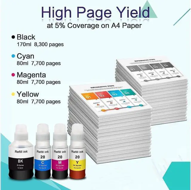 Page Yield: 8, 300 pages per compatible GI 20 ink bottle black, 7, 700 pages per compatible GI 20 color ink bottle. (at 5% coverage on A4 paper)