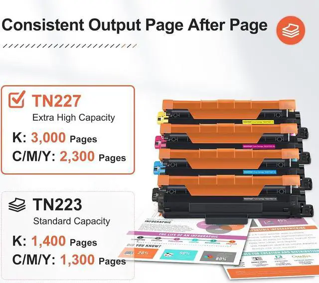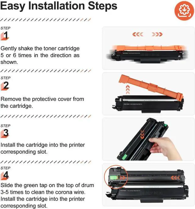 [Warm Tips] After installing the tn227 high yield toner cartridges, your printer may display "No Toner" "Cannot Detect" "Cartridge Error" message, please reinstall the cartridges to make sure the chip of the toner cartridge is in good contact with the printer.