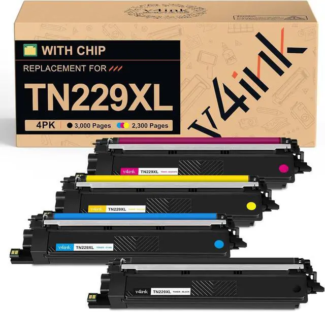 Package Includes: 4 packs of v4ink TN229XL toner cartridges (Black Cyan Magenta Yellow) and an install instruction; Latest Upgraded Chip Version