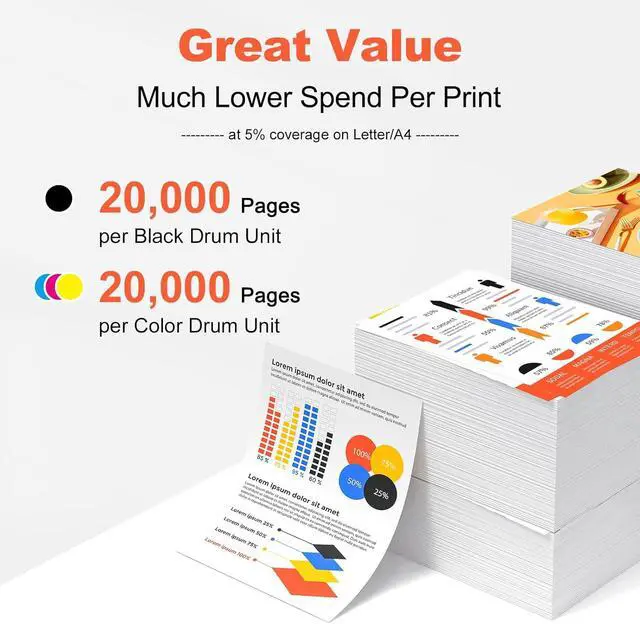 Page Yield: DR229CL B/C/M/Y toner cartridge is 20,000 pages per DR229CL black toner cartridge, DR-229CL C/M/Y is 20,000 pages per DR229CL color toner cartridge at 5% coverage, more pages compared with standard yield toner DR229CL drum unit