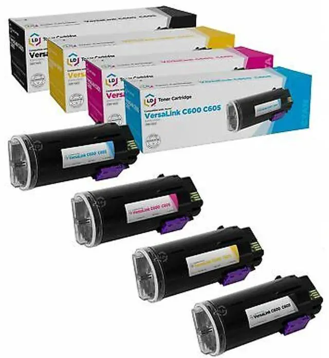 This offer includes (1) 106R03903 Black, (1) 106R03900 Cyan, (1) 106R03901 Magenta and (1) 106R03902 Yellow High Yield laser toner cartridges; they replace the original Xerox VersaLink C600 and C605 toner series. This toner cartridge set is guaranteed to work with Xerox Versalink C600 DT, C600 DX, C600 DXF, C600 DXP, C600 N, C600DN, C605 X, C605 XP, C605 XTF, C605 XTP and C605XF printers. Please note, retail packaging may vary and these toner cartridges will only work with printers purchased within the United States and Canada.