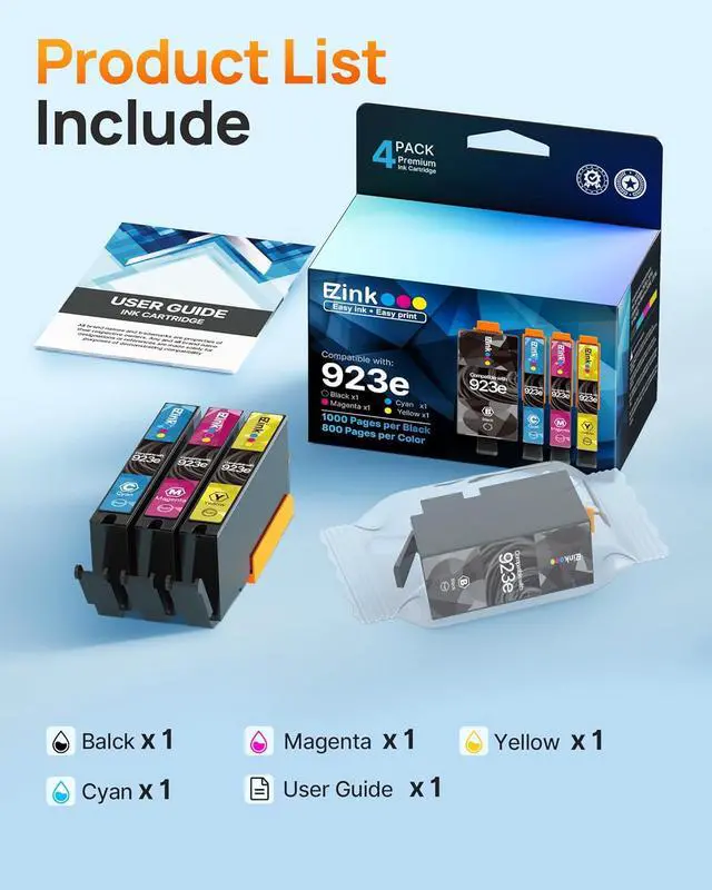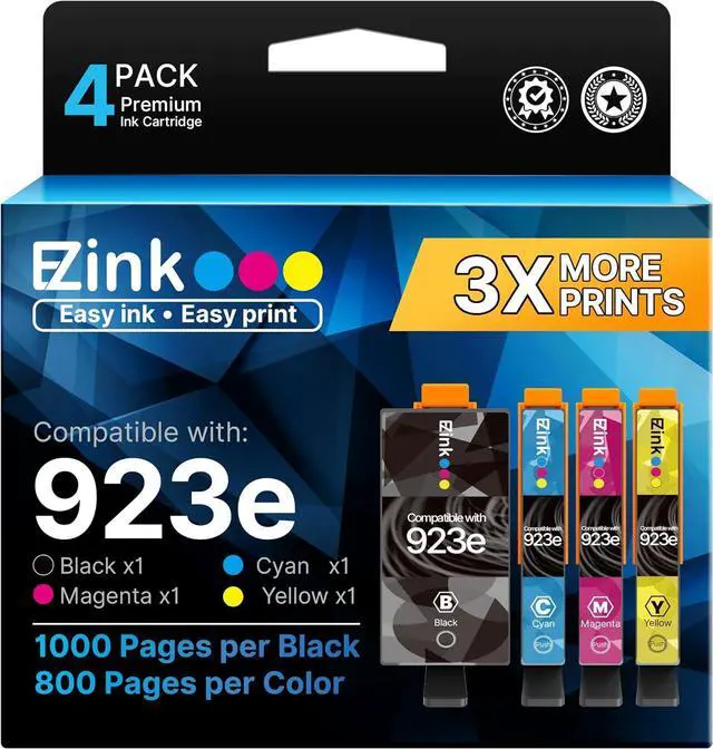 E-Z Ink for HP 923xl Ink Cartridges Combo Pack Contents: 1 × 923XL Black, 1 × 923XL Cyan, 1 × 923XL Magenta, 1 × 923XL Yellow Ink Cartridge, 1 x User Guide. HP 923 black ink cartridges yield up to 1000 pages, and color ones 800 pages, based on 5% A4 coverage.