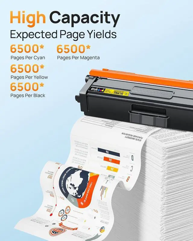 Page Yield: Black is 6,500 pages per TM436 toner cartridge and Color is 6,500 pages per toner cartridge at 5% coverage